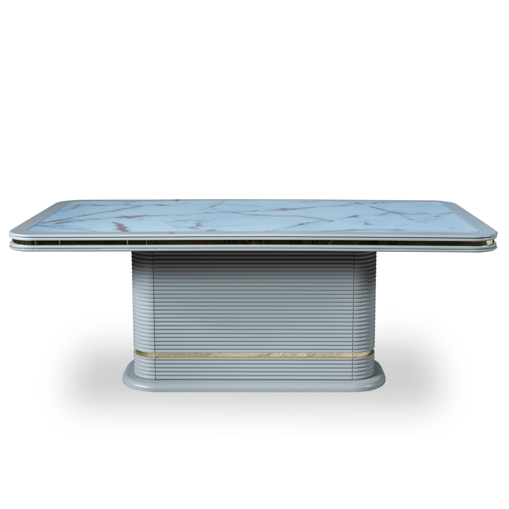 An elegantly attractive centerpiece for any dining room, this table's main attraction is the gorgeous, high-quality 22 mm MDF w 4 mm marble design. With professional implementation, CNC processing and high-quality import paint provide a striking and shiny look to the top and legs.
